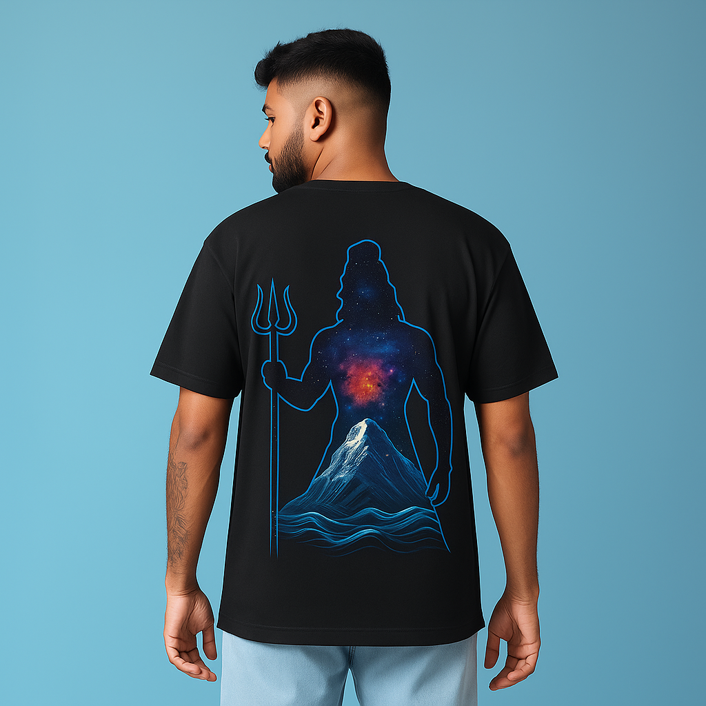 From his glowing Trishul to the majestic Mount Kailash rising from his core, this artwork reflects the eternal connection between divine consciousness and the elements of nature. Whether you're meditating, heading to a spiritual event, or just expressing your devotion in everyday life, this tee radiates depth, devotion, and cosmic grace.
