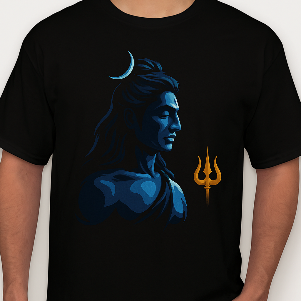 Channel inner strength and serenity with the Divine Focus Shiva T-Shirt, a minimalist yet impactful artwork of Lord Shiva. This design features a sharp, celestial blue profile of Shiva with the crescent moon in his hair and a glowing golden Trishul by his side — symbolizing cosmic protection, meditation, and power.