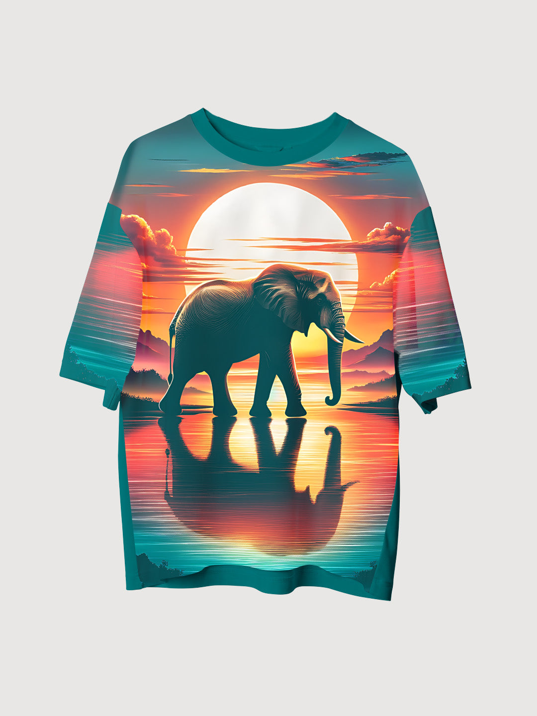 Celebrate the beauty of wildlife and stunning landscapes with the "Elephant Sunset Reflection Oversized Cotton T-Shirt." A timeless piece for those who love art and nature.
