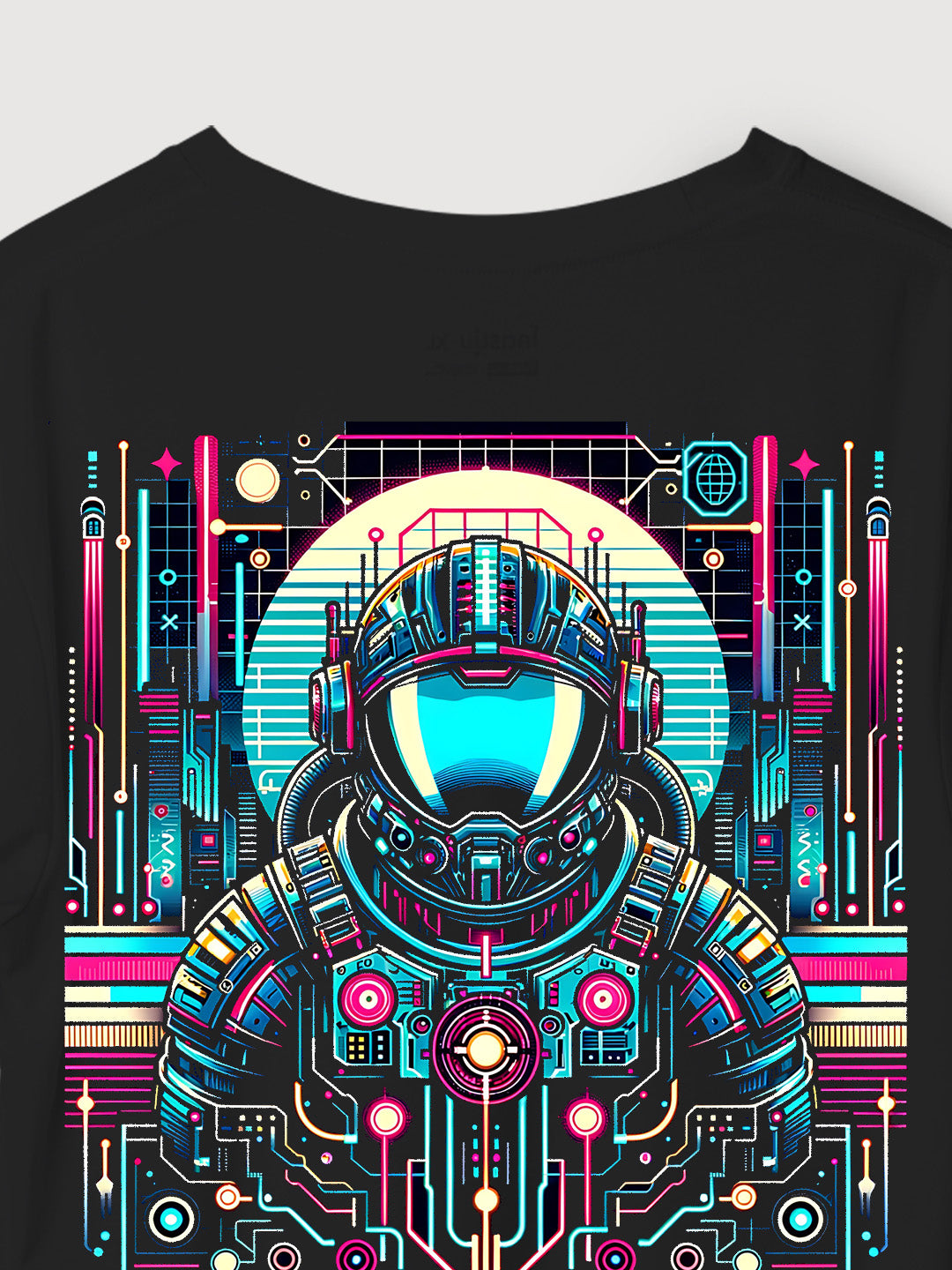 - Design: Cyberpunk-inspired astronaut graphic with vibrant neon colors